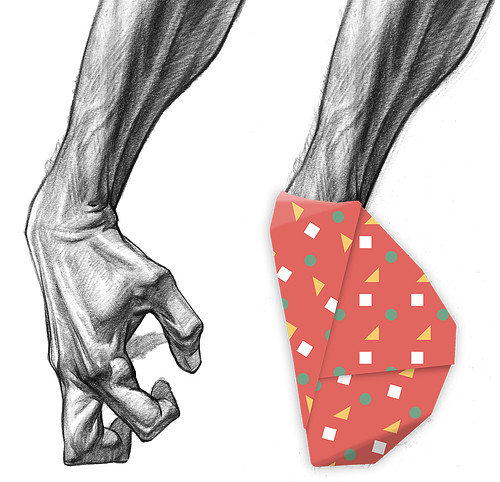 A really common way to start a drawing is with an envelope. A big shape that contains everything. This hand has so many small shapes that it would be difficult to jump right in. Imagine it gift wrapped. By doing this I can look at the big angle changes, and rhythms where things line up. I can measure the width to height relationship of this big shape. Once I’m confident that it’s accurate, it’s much easier to break it up into smaller shapes. Keep It Simple Stupid.