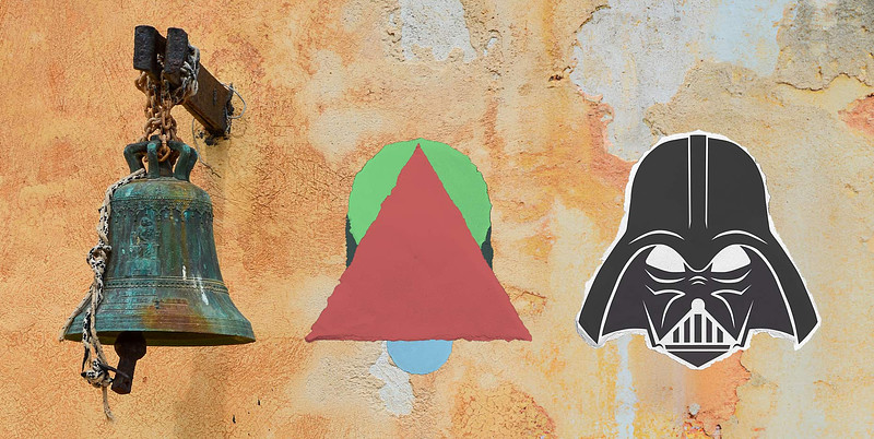 A bell is this oval on top, transitioning to this flat triangle on bottom, and a small circle underneath. This communicates the idea of a bell.. or Darth Vader.