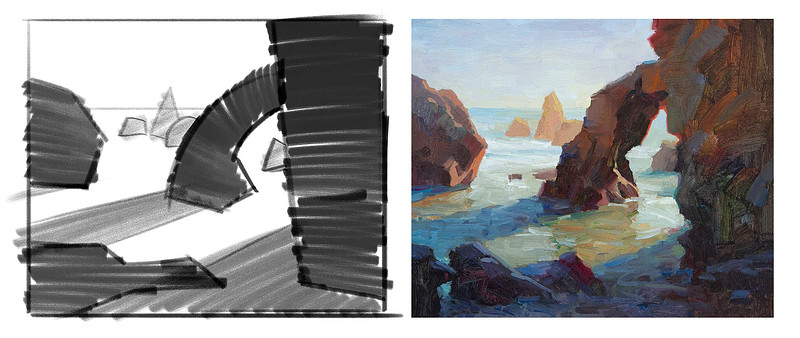 When I go out plein air painting, I always start with a small thumbnail, exploring the major elements that makeup the composition. Individually these shapes don’t mean much, but together, they're an afternoon in Malibu. You don’t have to draw complicated details to have a complex message. You just have to combine simple shapes in meaningful ways.