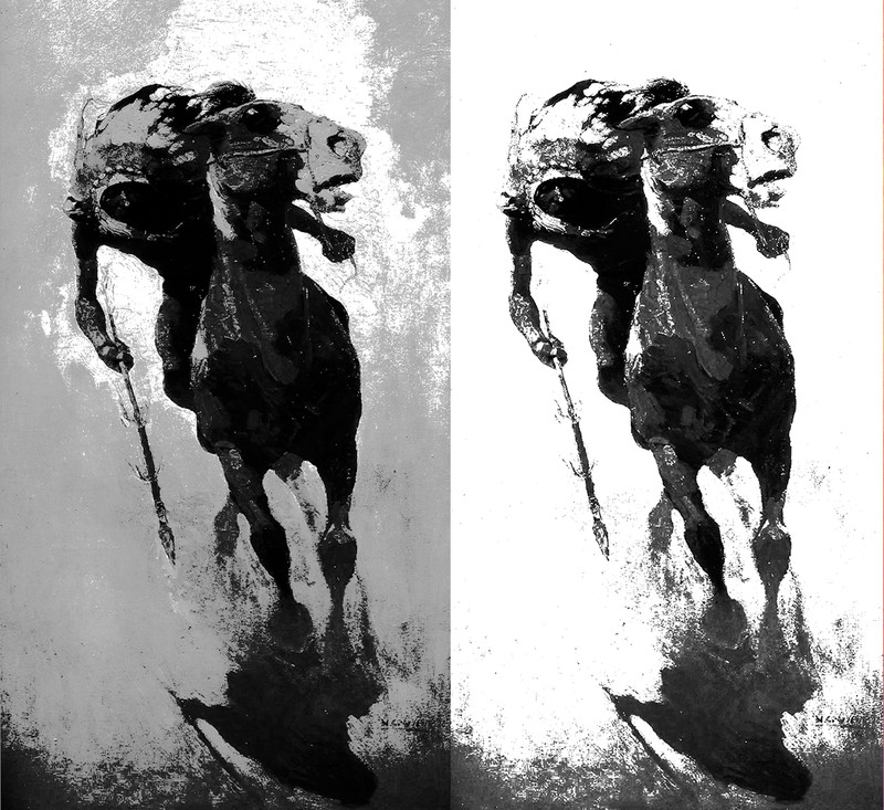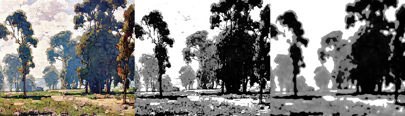 Here are 3 and 2-value versions of the same painting with the thresholds adjusted: