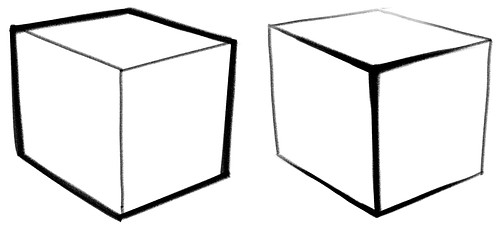 But you can show depth within an object too. Let’s take a simple box. Earlier we talked about making the outer lines heavier. But this flattens it, stylizes it, makes it more graphic. This is great, but what if we want to show depth? Thicken the lines at the corners and edges closest to the viewer, and gradually lighten the line weight as they recede into space.