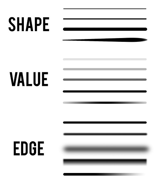 We can ignore the edge quality for now. And if you really want to simplify it as you’re starting out, you can ignore the value, and think of thick, medium, and thin lines. Even just those 3 can do a lot for your drawing.