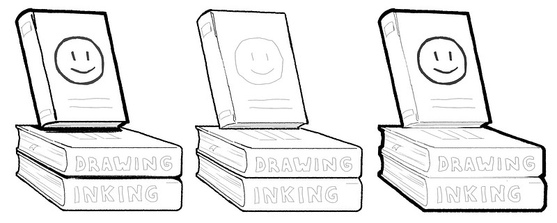 When varying your line weight, I want you to think of a hierarchy. To create a sense of hierarchy, you want to reserve the heaviest line weight for your focal point area because your eye will go to the area of most contrast. So if I want the books to stand out more, I switch the hierarchy. And if I want the image on the cover of the book to be most important, I can give it an even heavier line! I'm using line weight to direct the viewer's eye where I want them to look.