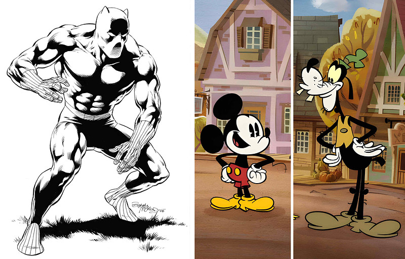 But you can even see this in highly stylized cartoon drawings. Check out these Mickey Mouse drawings. Look how Mickey’s shoe is thickest where it pokes out. And Goofy's nose is thickest here.