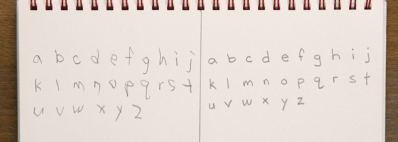 If you can write the alphabet, you have enough hand-eye coordination to draw a masterpiece. Tight, complicated little letters require hand-eye coordination. You can see my left-handed alphabet looks pretty terrible, but the difference between my right-handed drawing and left-handed drawing isn’t as big.