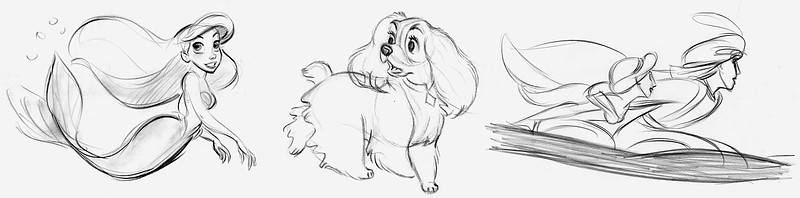 If you look at Disney production sketches, you can see how the animators use tapered strokes. They're very loose and gestural. The drawings are not clean, but they're drawn deliberately with purpose. There's an intentional energy in these drawings, and there is no confusion or hesitation in their strokes. They're not uptight, and that makes these drawings very beautiful. I would even argue that the loose drawings look better than the clean versions when they're individual images because cleaning them up loses some of that energy and charm.