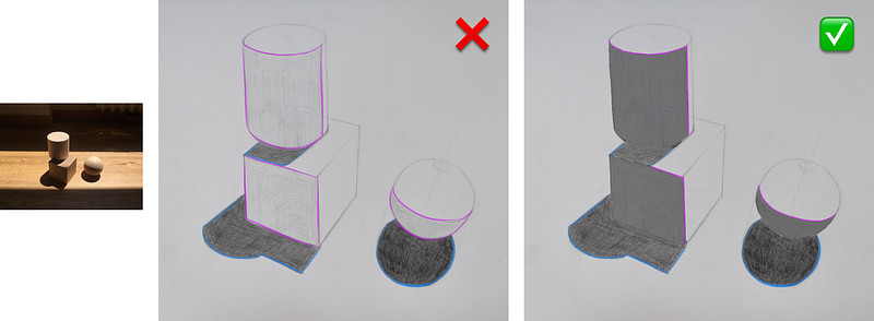 - Tone in the form shadow and cast shadow, each with a flat, unified tone.