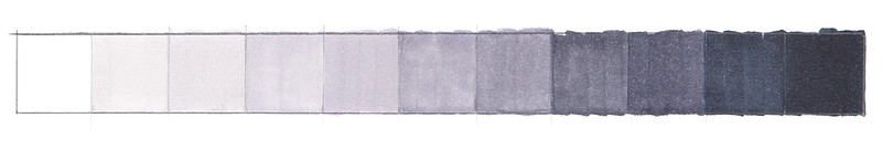 If you have markers, try making a value scale with them. I have this OLO marker set which includes a range of predefined values of cool, warm, and red greys. Using markers CG1, CG3, CG5, CG7, and CG9 (or Black) on white paper provides six values straight of the box. However, applying the marker evenly in each square takes practice.