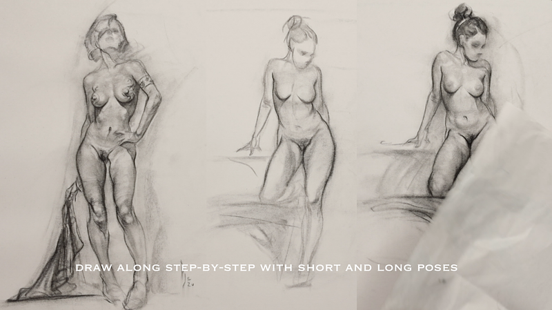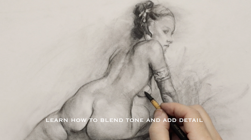 You'll learn how to find the long, rhythmic lines that flow through the human body. How to draw male and female figures and understand the small anatomical differences that create huge visual changes. How to work with charcoal, pencil, chamois, and kneadable erasers to get expressive, painterly results from the simplest tools. How to tackle foreshortening without fear. How to use shadow, tone, and contrast to sculpt three-dimensional form on flat paper. And how to know when a drawing is finished before you render the life out of it.