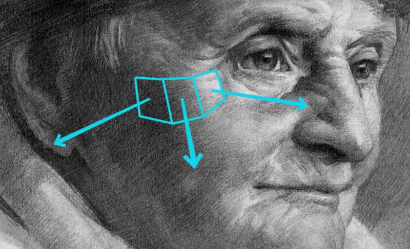 Let’s observe the planes of her cheek. She is facing to the right towards the light source. So, this plane is facing that way. The halftone to the left of that is facing us and then the shadow plane in the side of the cheek is facing towards the left side. These 3 transitions along the forms come together to create volume. Individually, they would look like flat value, but together, as a gradation, they appear 3-dimensional.