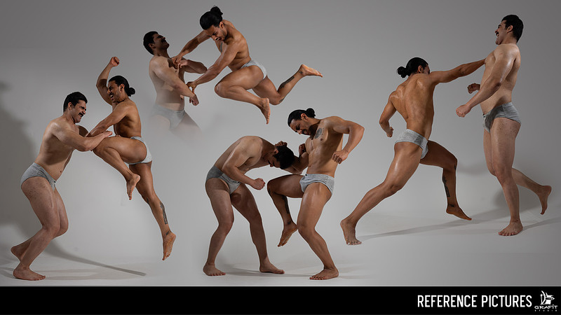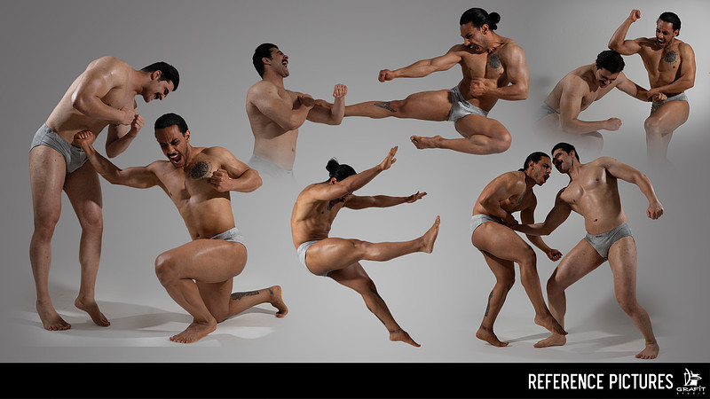 In the set, you’ll find one-on-one combat interactions with punches, kicks, blocks, grapples, throws, and mid-air strikes. The poses show bodies twisting, weight shifting, muscles fully engaged, and reactions pushed to their extremes — from explosive attacks to off-balance recoveries and dramatic hits. Each interaction reads clearly, making it easy to study cause-and-effect in motion, timing, and physical storytelling.