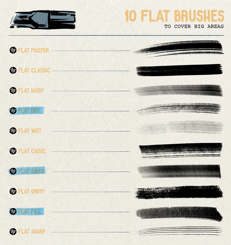 These versatile brushes are excellent for achieving traditional-style techniques. Since they are the most versatile brushes in the pack, you can use them for everything. Even sketching and texturing.