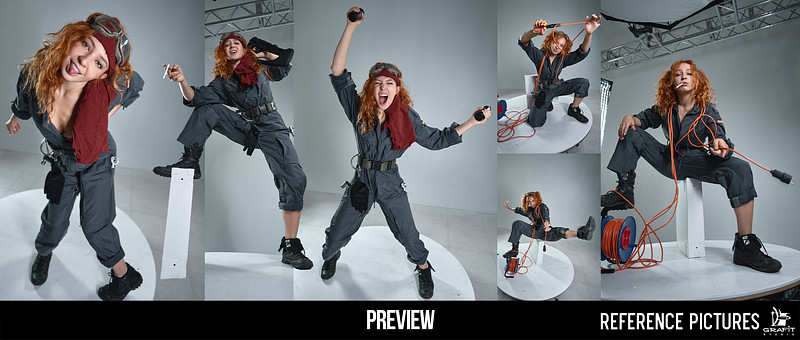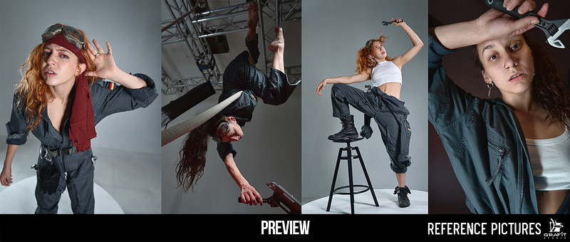 1250+ Dual Motion: Female Dynamic Poses is a reference pack featuring two expressive female models in dynamic, action-oriented poses inspired by aviation mechanics and technical environments.