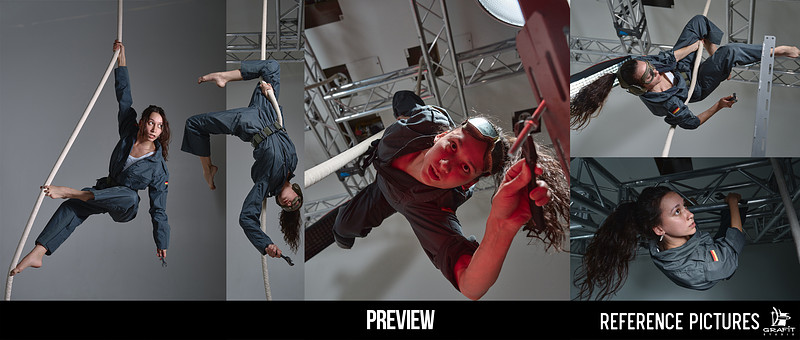 1. Aerial & crawling poses — one model is photographed in mid-air using a rope system, creating floating, climbing, and hanging poses ideal for character design, action scenes, and dynamic compositions.